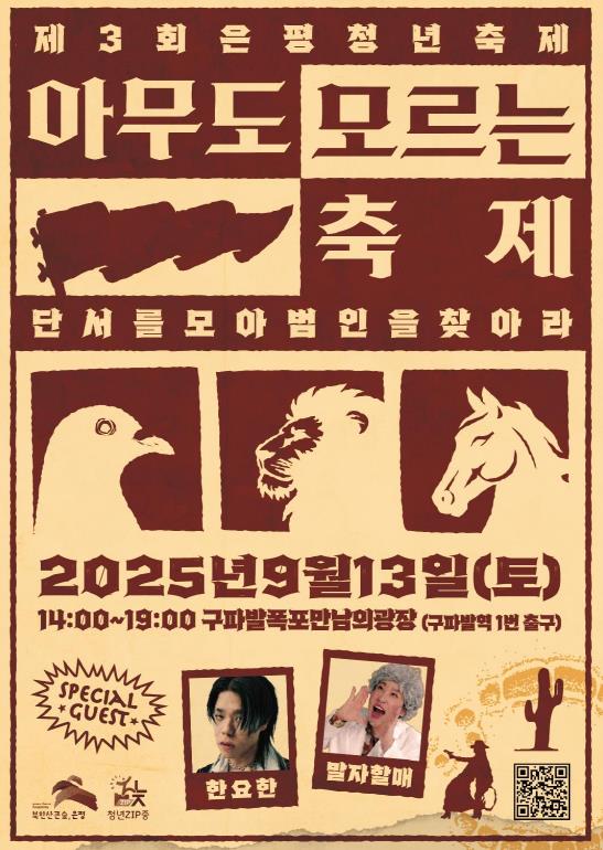 지난 4월 구성된 은평청년축제기획단은 축제의 주제와 콘셉트 기획부터 홍보 운영까지 주도적으로 참여했다. 주요 프로그램인 ‘영꾸꾸의 비니를 찾아라!’는 청년들이 서부의 보안관이 돼 은평구의 청년캐릭터 영꾸꾸의 비니를 훔쳐간 범인을 찾는 추리 게임으로, 축제의 몰입도를 높이고 색다른 재미를 극대화할 예정이다.