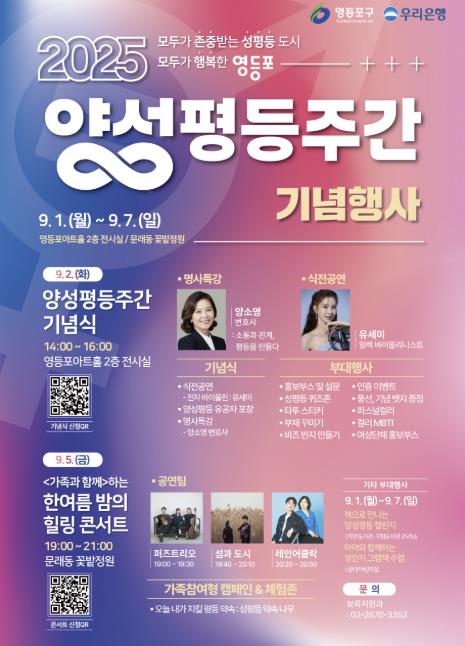 최호권 영등포구청장은 “이번 양성평등주간이 성평등에 대한 공감대를 넓히는 계기가 되길 바란다”라며 “앞으로도 구민 모두가 존중받는 성평등 도시, 행복한 영등포를 만들어가겠다”라고 전했다.