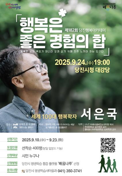 제182회 당진행복아카데미에 참석을 원하는 시민은 당진시평생학습플랫폼 ‘배움나루’를 통해 23일 오후 6시까지 사전 신청할 수 있으며, 선착순으로 400명까지 모집한다. 잔여 좌석에 한해 당일 현장 참석도 가능하다.