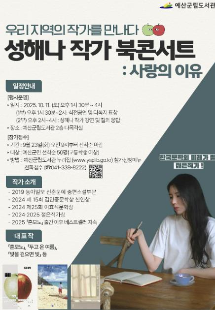 성해나 작가는 예산군 출신 소설가로, 2019년 동아일보 신춘문예 당선으로 데뷔한 후 꾸준한 작품 활동을 이어오며 2024‧2025 문학동네 젊은작가상, 2024 이효석문학상 우수작품상, 2024 김만중문학상 신인상을 수상하는 등 최근 가장 주목받는 작가 중 한 명이다.