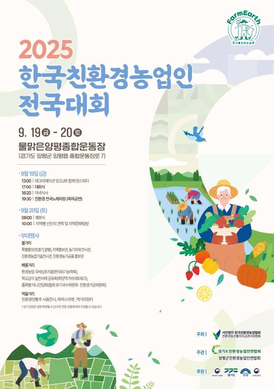 경기도는 오는 19일부터 20일까지 양평 물맑은양평종합운동장에서 ‘2025 한국친환경농업인 전국대회’를 개최한다고 밝혔다. 전국 10개 시도 친환경농업인 1만여 명이 참여하는 대규모 행사로, 친환경 실천 결의와 기후위기 대응 방안을 공유하는 교류의 장이 될 전망이다.