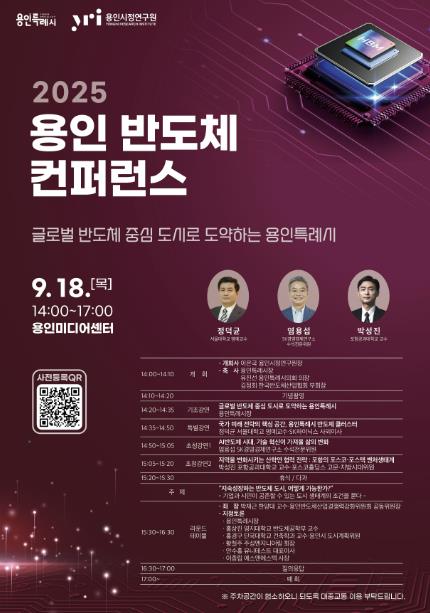 용인특례시는 재단법인 용인시정연구원과 함께 18일 오후 2시 용인미디어센터에서 ‘2025 용인 반도체 컨퍼런스’를 연다고 11일 밝혔다.