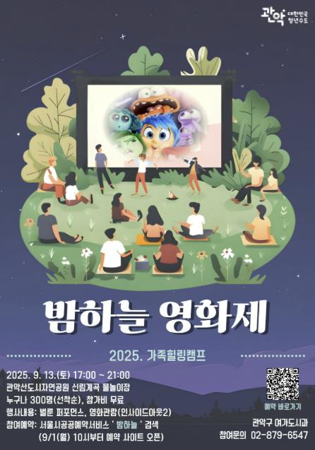 관악구가 오는 13일 ‘밤하늘 영화제’를 개최해 관악산 자연 속에서 가족, 친구들과 함께 힐링하는 여름밤 추억과 낭만을 선사할 예정이다.