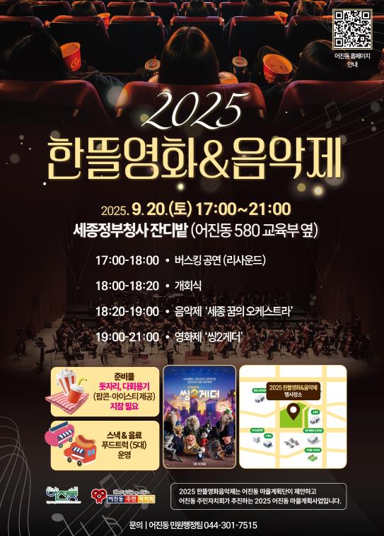 정성헌 어진동주민자치회장은 “한뜰영화·음악제를 주민 모두가 함께 어울리고 소통하는 어진동 대표 문화축제로 꾸준히 발전시켜 나가겠다”며 “가족과 함께 음악을 듣고 영화를 보며 가을밤을 만끽하시길 바란다”고 말했다.