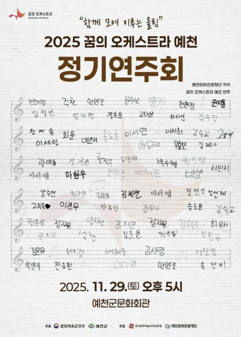 예천문화관광재단은 오는 29일 오후 5시, 예천군문화회관에서 '2025 꿈의 오케스트라 ‘예천’ 정기연주회 '함께 모여 이루는 울림''을 개최한다.