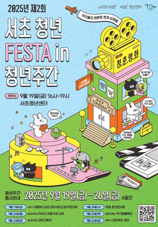 19일에 열리는 개막행사는 ‘청.춘.영.화(우리의 청춘은 현재 상영 중)’라는 주제로 진행된다. 유상욱 마술사의 해리포터 콘셉트 공연을 시작으로 모범 청년을 격려하는 ‘서초청년상’ 시상식이 열리고, 70만 구독자를 보유한 유튜버 드로우앤드류가 ‘나의 N잡 성공기: 좋아하는 일로 경제적·시간적 자유를 얻는 법’을 주제로 청춘들의 고민 상담 토크콘서트를 진행한다. 이날 센터 곳곳은 영화 콘셉트 체험부스로 꾸며져 ‘악마는 프라다를 입는다’ 부스에서는 퍼스널 컬러 진단 체험을, ‘라라랜드’ 부스에서는 달 무드등 만들기 체험 등을 즐길 수 있다.
