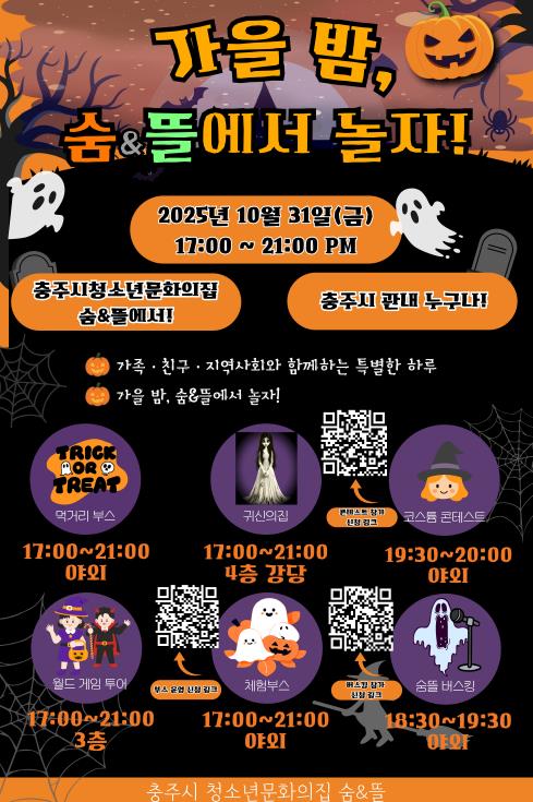 충주시청소년문화의집 숨·뜰에서는 10월 31일 오후 5시부터 9시까지 ‘가을밤, 숨뜰에서 놀자!’ 행사를 진행한다고 밝혔다.