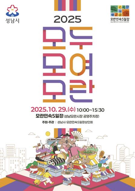 성남시는 오는 10월 29일 오전 10시부터 오후 3시 30분까지 모란민속5일장(중원구 둔촌대로 68)에서 ‘2025 모두모여모란’ 축제를 연다.