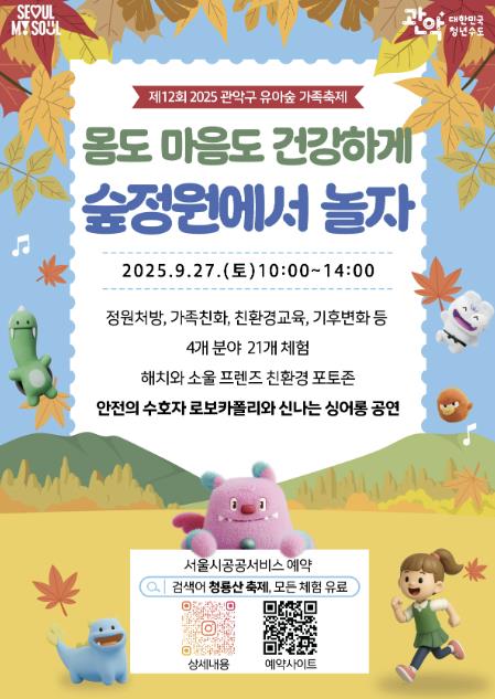 관악구가 오는 27일 오전 10시부터 오후 2시까지 청룡산 유아숲체험원에서 ‘2025년 제12회 유아숲 가족 축제’를 개최한다.