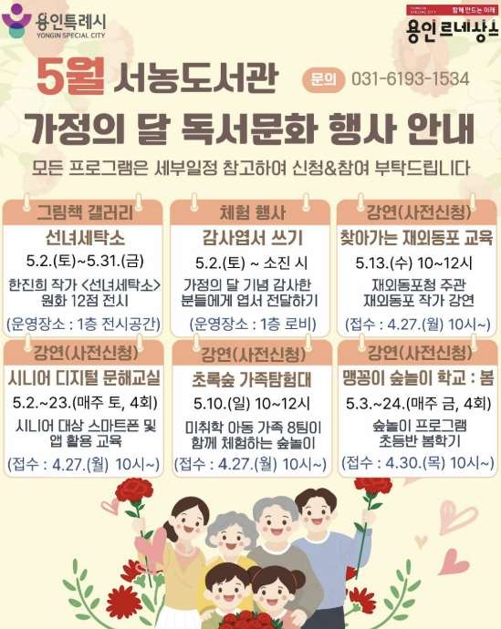 용인특례시 서농도서관은 오는 5월 가정의 달을 맞아 다양한 세대를 아우르는 프로그램으로 이뤄진 ‘2026년 5월 독서문화행사’를 마련했다고 21일 밝혔다.