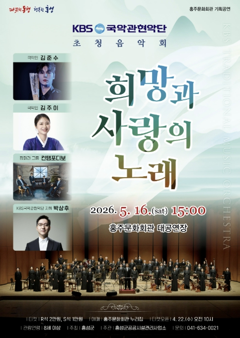 홍성군 홍주문화회관은 오는 5월 16일 오후 3시, 가정의 달 특별 기획으로 'KBS국악관현악단 초청음악회 - 희망과 사랑의 노래'를 무대에 올린다.