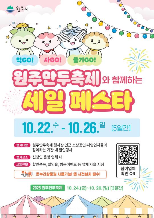 원주시는 지역 대표 축제인 원주만두축제와 연계해 구도심 상권을 활성화하기 위해 오는 22일부터 26일까지 5일간 ‘원주만두축제와 함께하는 세일 페스타’를 개최한다.