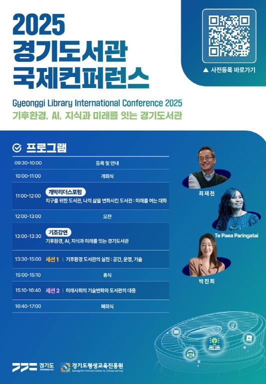 경기도와 경기도평생교육진흥원은 오는 23일 수원컨벤션센터 컨벤션홀3에서 ‘기후환경, AI, 지식과 미래를 잇는 도서관’을 주제로 ‘2025 경기도서관 국제콘퍼런스’를 개최한다.