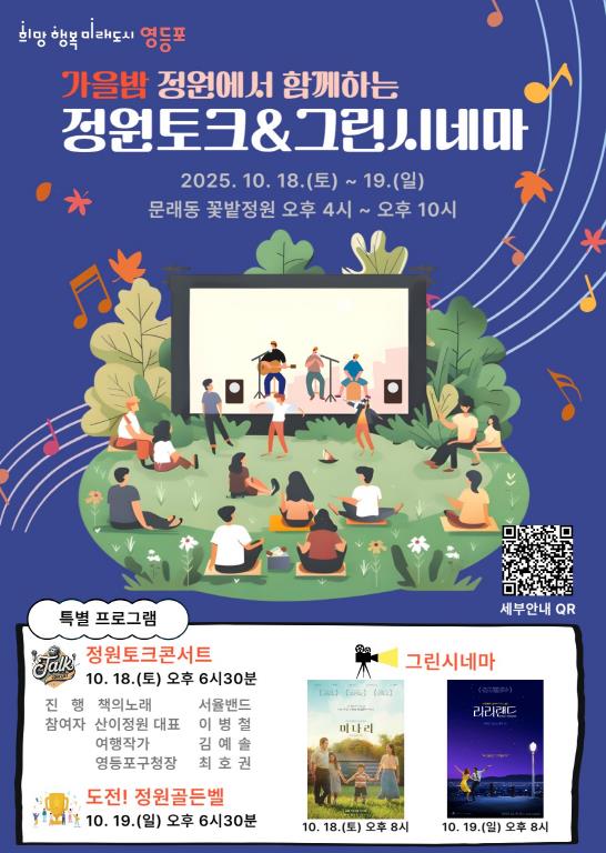 영등포구가 오는 10월 18일부터 19일까지 이틀간 문래동 꽃밭정원에서 ‘정원토크콘서트 · 그린시네마’를 개최한다고 밝혔다. 이번 행사는 주민들이 자연과 문화예술을 함께 즐길 수 있도록 마련된 가을 문화축제다.