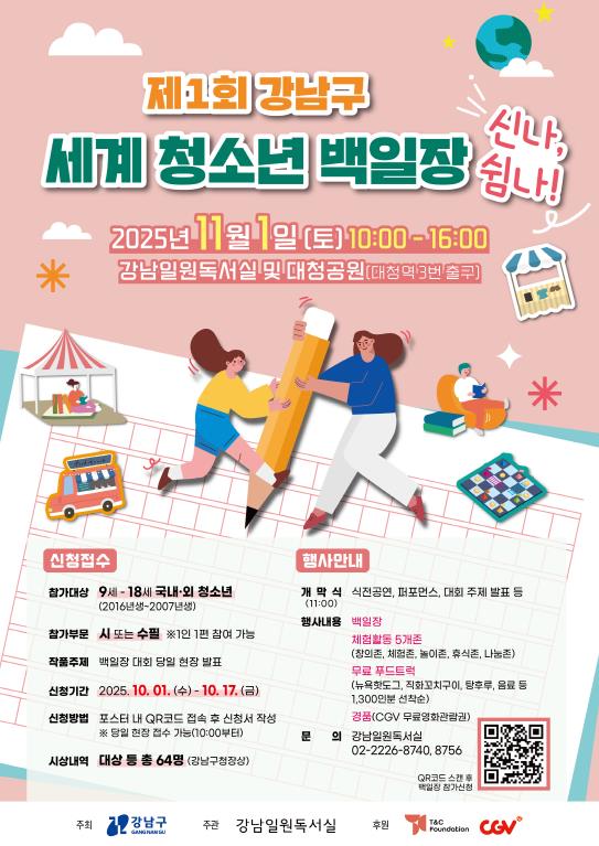 꿈이 모이는 도시, 미래를 그리는 강남구가 오는 11월 1일 오전 10시부터 오후 4시까지 강남일원독서실과 대청공원 일대에서 ‘제1회 강남구 세계청소년백일장 신나, 쉼나!’를 개최한다. 이 행사는 국내‧외 국적 청소년이 함께하는 전국 최초의 기초지자체 주관 백일장으로, 다문화 시대와 K-컬처 확산 흐름에 발맞춘 문학축제다.