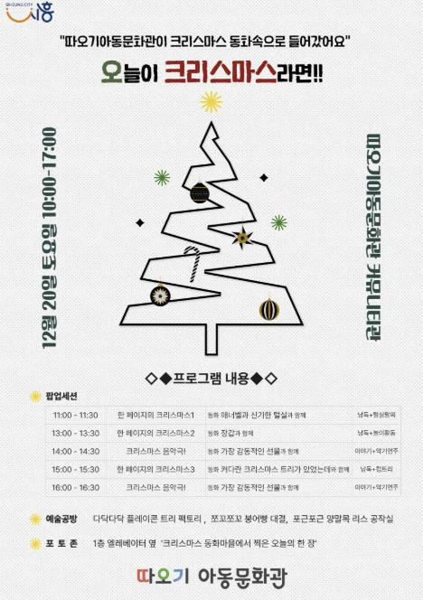시흥시 따오기아동문화관이 오는 12월 20일 크리스마스 문화행사 ‘오늘이 크리스마스라면’을 연다. 반짝이는 트리, 서늘한 겨울 공기, 책장을 넘기는 소리가 한데 어우러지며 문화관은 잠시 ‘이야기가 살아 움직이는 공간’으로 변한다.