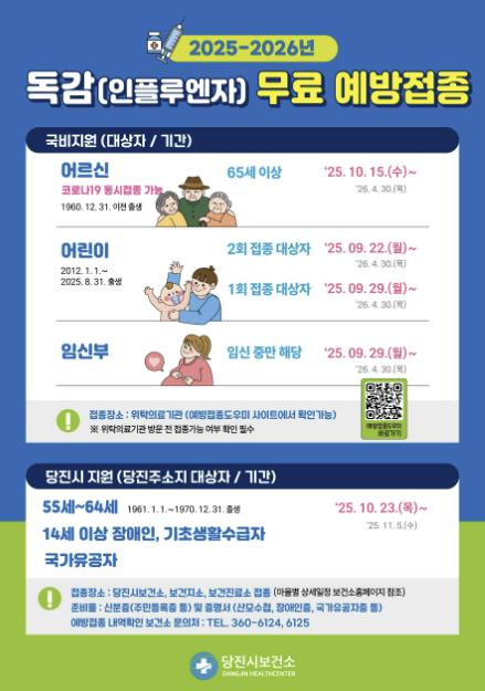 박종규 당진시보건소장은 “본인과 가족의 건강을 위해 인플루엔자 유행 시기(11월~이듬해 4월) 전 예방접종을 완료해 주시기를 당부한다”고 전했다.