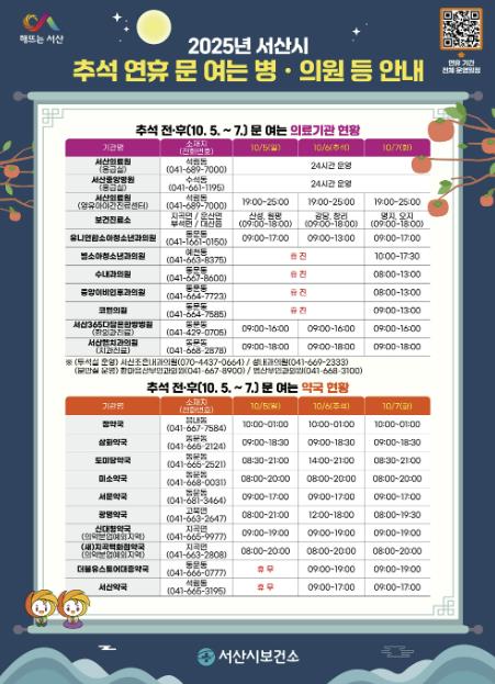 김용란 서산시보건소장은 “연휴 기간 진료 이용에 불편이 없도록 세심히 살펴 시민과 귀성객 모두가 건강하고 안전한 추석을 보내실 수 있게 최선을 다하겠다”라고 말했다.