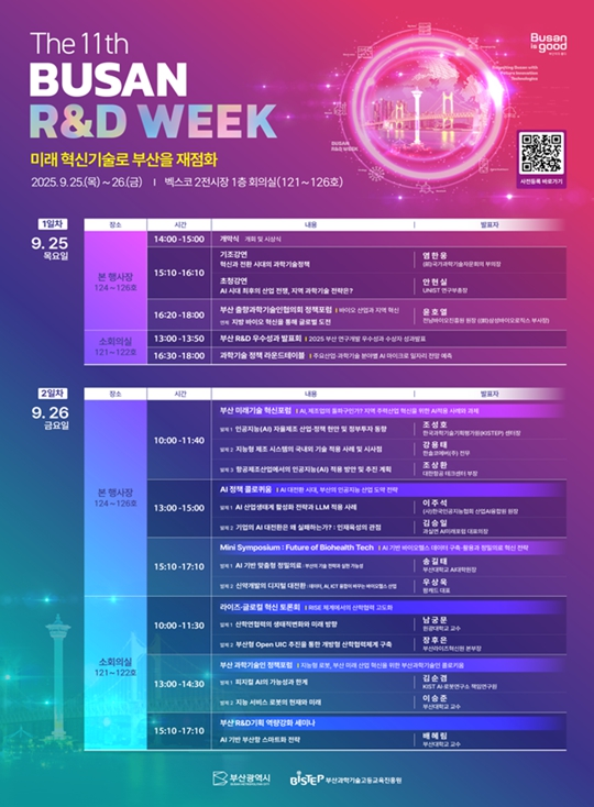'부산 연구개발(R·D) 주간'은 부산 과학기술의 현주소와 미래를 논의하는 산·학·연·관 소통의 장으로, 2015년 시작 이후 매년 확대·발전해 왔다. 올해로 11회째를 맞이한 이번 행사는 지난해 보다 다양한 주제와 프로그램으로 구성된다.