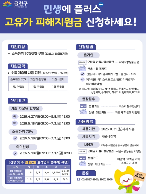 금천구는 중동 정세 불안 등으로 촉발된 고유가·고환율·고물가 상황에서 구민의 생활 부담을 완화하고 지역경제를 활성화하기 위해 오는 27일부터 ‘1차 고유가 피해지원금’ 신청 접수 및 지급을 시작한다고 밝혔다.