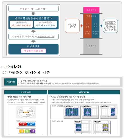 ▲역세권 등의 대상지가 사업 입지 요건에 부합하는 경우, 주거지역에서 상업지역으로의 용도지역 변경을 허용해 용적률을 높이고 ▲사업자가 업무시설 등 복합용도를 도입하면 용도지역을 추가로 상향해 최대 용적률을 확보할 수 있도록 한다.