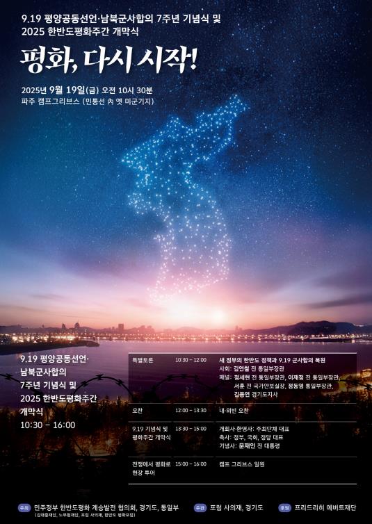 경기도와 통일부, 민주정부 한반도평화 계승발전협의회가 공동으로 주최하고 프리드리히 애버트 재단이 후원하는 ‘9.19 평양공동선언 7주년 기념행사’가 오는 19일 오전 10시 30분 파주 캠프그리브스에서 열린다.