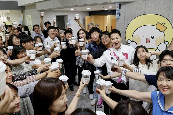 ▲ 오언석 도봉구청장과 직원들이 청렴 문구가 적힌 음료 잔을 들고 사진을 찍고 있다 |