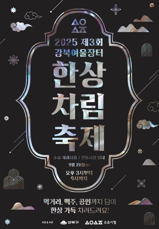 서울 강북구는 오는 9월 20일 오후 3시부터 저녁 9시까지 수유재래시장과 전통시장 일대(도봉로67길, 도봉로71길)에서 ‘강북 여울장터 '수유 한상차림 축제 둘째마당'’을 개최한다.