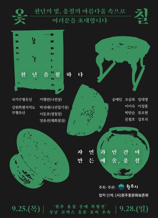 이번 특별전은 자매결연 도시인 서울 강남구의 ‘2025 강남 페스티벌’ 행사와 연계해 원주시 옻칠 공예 장인들의 아름다운 작품을 선보인다.