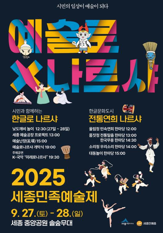 세종특별자치시가 주최하고 한국민족예술단체총연합회 세종지회가 주관하는 2025 세종민족예술제 ‘예술로 나르샤’가 오는 27∼28일 이틀간 세종중앙공원 솔숲 무대에서 펼쳐진다.
