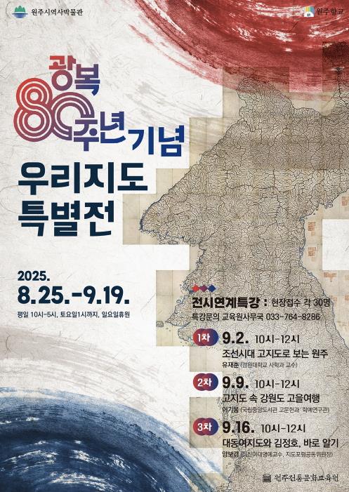 원주전통문화교육원은 광복 80주년을 기념해 8월 25일부터 9월 19일까지 ‘우리지도 특별전’을 개최한다.