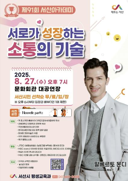 이번 서산아카데미는 ‘서로가 성장하는 소통의 기술’을 주제로, 일상에서 더 나은 관계를 형성할 수 있는 소통법, 서로를 이해하며 함께 발전해 나가는 방법에 대해 다룬다.