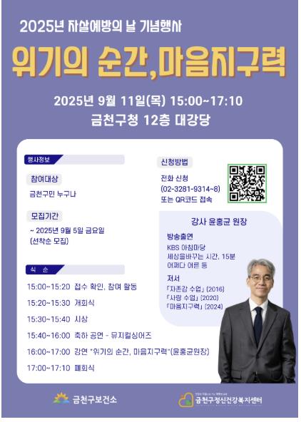 이번 행사에서는 KBS ‘아침마당’, 인기 강연프로그램 ‘세상을 바꾸는 시간, 15분(세바시) 등 다양한 방송 매체에 출연한 바 있는 윤홍균 정신건강의학과 전문의를 초청하여 ‘위기의 순간, 마음지구력’을 주제로, 따뜻한 위로를 주는 자살예방 강연을 듣는다.