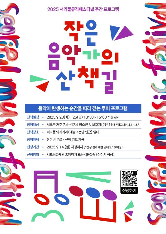 9월 23일~26일, 서리풀 악기거리에서는 음악가의 일상과 공간을 체험하는 도보형 프로그램 ‘작은 음악가의 산책길’이 진행된다. 예술의전당 무대 탐방을 시작으로 서리풀아트스튜디오, 악기 공방, 클래식 연습실 등을 둘러보며 음악이 만들어지는 과정을 가까이에서 경험하고, 악기 장인과 연주자의 이야기를 직접 들을 수 있다. 주민들의 뜨거운 반응으로 모집은 마감됐으며, 선정 결과는 16)에 개별적으로 안내될 예정이다.