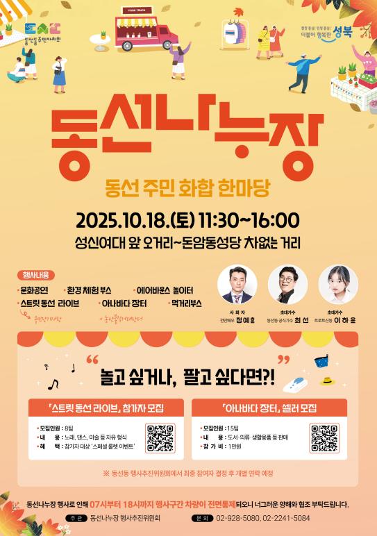 서울 성북구가 오는 10월 18일 오전 11시 30분부터 오후 4시까지 성신여대 앞 오거리에서 돈암동성당 구간까지 이어지는 도로에서 ‘2025년 차 없는 거리 동선나누장’을 개최한다.