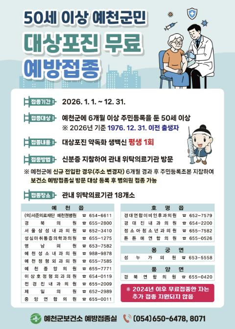 예천군은 2026년 50세 이상 대상포진 무료 예방접종 사업을 연중 실시한다.