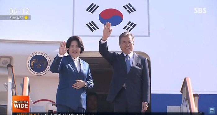 | ▲ 대통령 전용기에 오르는 문재인 대통령과 김정숙 여사. <사진=SBS뉴스 화면 갈무리> |