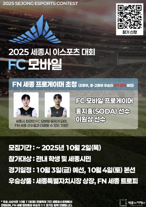 시는 이스포츠 연고 구단인 FN세종이 주관하는 ‘2025 세종시 이스포츠 경기대회’ 참가자를 내달 2일까지 모집한다고 밝혔다.