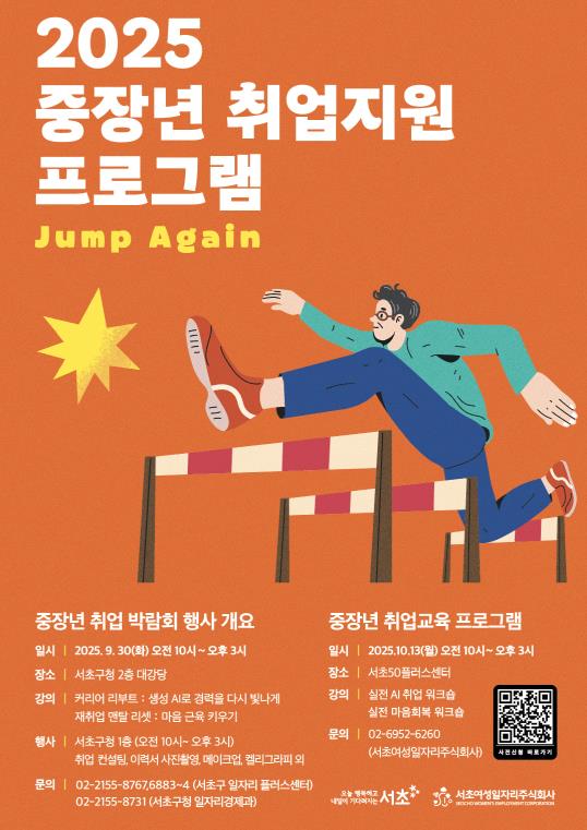 서울 서초구는 중장년의 구직 활동을 응원하기 위해 오는 30일 취업지원 프로그램 ‘점프 어게인(JUMP AGAIN)’을 개최한다고 밝혔다.