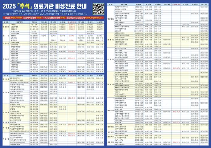 시흥시는 추석 연휴 기간인 10월 3일부터 9일까지 7일간 의료기관과 약국의 공백으로 인한 시민 불편을 최소화하고자 추석 명절 연휴 비상진료 기관과 휴일지킴이 약국을 운영한다.
