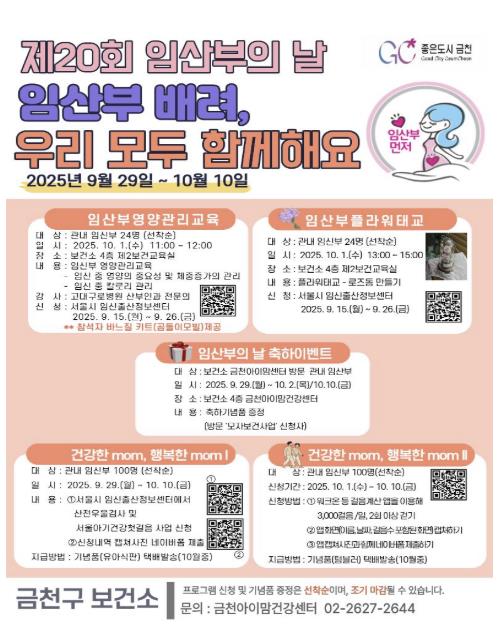금천구는 제20회 ‘임산부의 날’을 맞아 9월 29일부터 10월 10일까지 기념행사를 운영한다고 밝혔다.