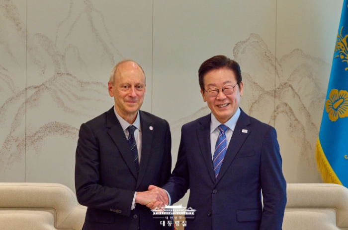 이재명 대통령은 오늘 오후 집무실에서 '정의란 무엇인가'의 저자인 마이클 샌델 미국 하버드대 교수를 접견했다.