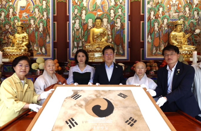 이재명 대통령 내외는 17일 오후 서울 은평구에 위치한 진관사를 방문했다. 진관사는 일제강점기 일장기 위에 먹물로 태극문양과 4괘를 덧칠해 만든 '진관사 태극기'와 독립신문이 발견된 역사적인 사찰이다.