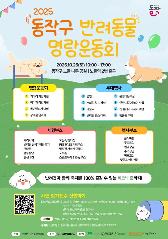 오후 1시부터는 본행사인 ▲어질리티 운동회(동반·장애물 달리기) ▲댄스대회 ▲위생 미용 교실 ▲개인기 놀이·펫마사지 수업이 이어지며, 행운권 추첨 이벤트도 진행된다. 각 프로그램은 홍보 포스터의 QR코드를 통해 사전 신청한 후 참여할 수 있다.
