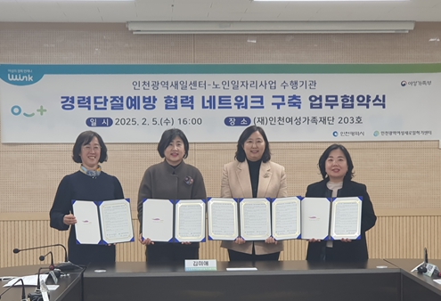 인천광역새일센터와 남동시니어클럽, 부평구노인인력개발센터, 서구노인인력개발센터는 2025년 2월 5일 (재)인천여성가족재단에서 경력단절예방 협력 네트워크 구축 업무협약을 체결했다.
