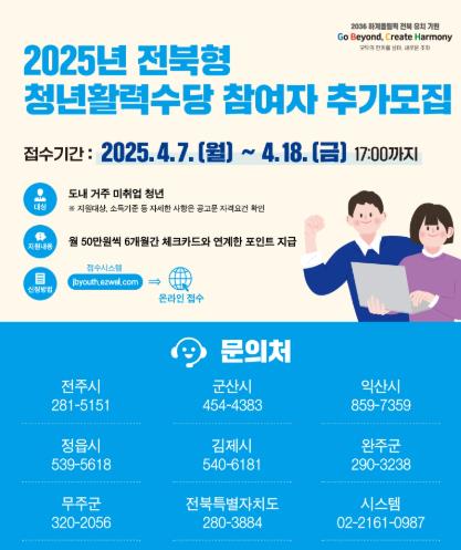 군산시가 미취업 청년들의 활발한 구직활동을 지원하는 ‘2025년 전북형청년활력수당’ 참여자를 4월 18일까지 추가로 모집한다.