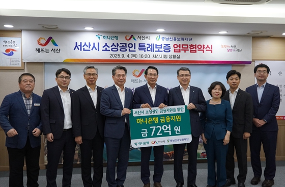 충남신용보증재단은 4일 서산시청에서 서산시, 하나은행과 함께 총 72억 원 규모의 소상공인 특례보증을 위한 업무협약을 체결했다고 밝혔다.