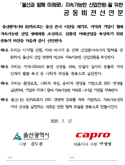 이 선언문에는 ▲디지털 전환과 미래에너지 분야의 전략적 협력 ▲지역 일자리 창출과 인재 육성 ▲이에스지(ESG) 기반의 책임경영 실천 ▲민관협력 모형(모델) 구축 등이 담겨 있으며, 울산시와 카프로가 함께 지속가능한 미래로 나아가겠다는 약속이 담겨 있다.