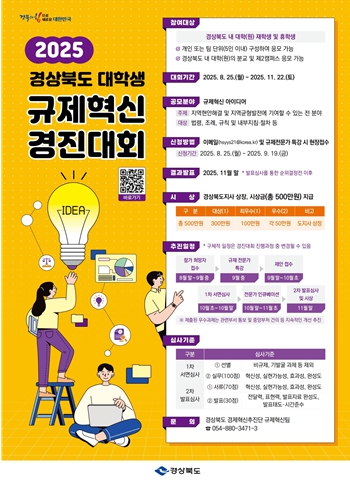 경상북도는 경북도 내 대학(원) 재학생과 휴학생을 대상으로 8월 25일부터 11월 22일까지 ‘2025 경상북도 대학생 규제혁신 경진대회’를 진행한다.