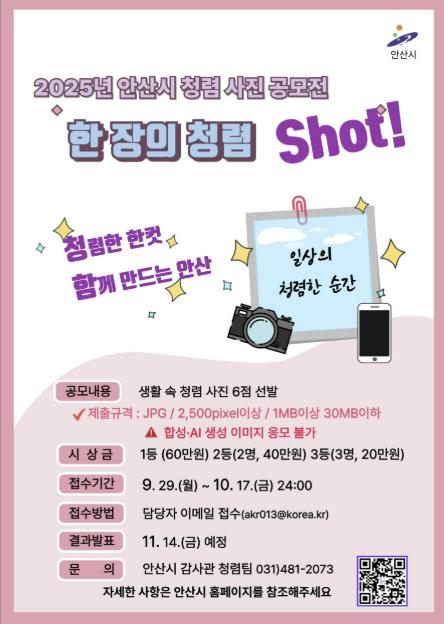 안산시는 청렴문화 확산과 시민 공감대 형성을 위해 ‘2025 한 장의 청렴, Shot! 사진 공모전’을 개최한다고 30일 밝혔다.
